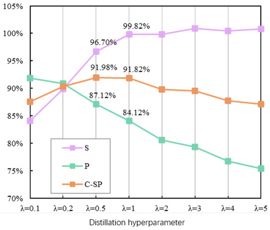 The SDCID method selected all the candidate boxes from the teacher model when selecting the region proposal box for distillation, and validation experiments were conducted for this part of the settings. Seven types of region suggestion box selection methods were set, the other settings of the SDCID method were kept unchanged, the selective mask was selected as M1, and its experimental results are shown in Table 6. It can be seen that the best results on three indicators, AP50, P, and C-SP, were obtained with the setting that all the region proposal boxes come from the teacher model, and the best results on the S indicator were obtained with the settings that the number of region proposal boxes from the teacher model and the student model were 8 and 56, respectively, but the results on other indicators were poor.