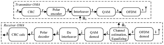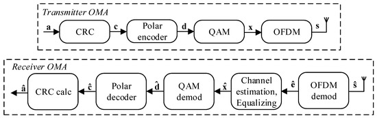 Table 1 shows the designations of the main vectors used in the model. Both types of channels (Figure 1 and Figure 2) use CRC (polynomials according to [2] of length L from 6 to 26.), input bits a, and output bits c (C1, C2). Both channels use quadrature amplitude modulation (QAM) with index M, and symbols at the output x, X1, X2. In the NOMA channel, the group signal is designated as y. The last stage is OFDM with output values s. The estimates of the corresponding values in the receiver after the processing stages are denoted as â, Â1, ĉ, Ĉ1, etc.
