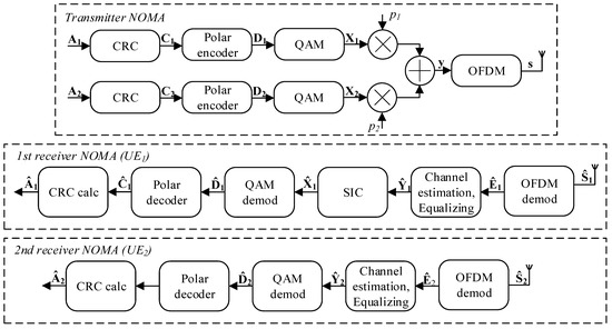 As part of the discussion on the 5G standard, a new approach to the formation of physical subchannels has been proposed, that is, the non-orthogonal multiple access (NOMA). Contrary to the orthogonal multiple access (OMA), NOMA implies simultaneous transmission of signals by subscribers in the same time–frequency resource. Several implementations of NOMA principles have been proposed: power division (PD-NOMA) [13], sparse code multiple access (SCMA) [14], rate splitting multiple access (RSMA) [15], etc. [16], which differ from each other in the principles of signal formation and separation (demodulation). It is shown that NOMA surpasses traditional methods based on OFDM in noise immunity and spectral efficiency. Therefore, NOMA is the main candidate for the physical layer architecture in 6G. It should be noted that 6G discussions are at an early stage; a specific NOMA technique has not been selected and the above-described technologies (PD-NOMA, RSMA, SCMA, etc.) continue to compete with each other [17]. NOMA combines multiple access and modulation procedures. Together with error correction coding, NOMA forms the basis of the physical layer and largely determines the main characteristics of the future communication networks. Thus, in this article we consider polar codes together with NOMA (PD-NOMA is chosen as an example) and, therefore, propose a physical layer concept for the next-generation communication networks. PD-NOMA topics are actively developing, with real applications within non-orthogonal multiple access technique operating communication systems, such as user association and contract-theoretic resource orchestration [18]. A relevant application of PD-NOMA is in simultaneous wireless information and power transfer (SWIPT) [19].