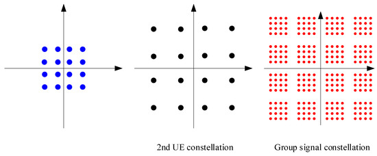 where p1, p2 are weighting factors responsible for the distribution of power between subscribers. The further away the subscriber is from the transmitter, the smaller its SNR is and the more power it will be allocated. To determine p1 and p2, depending on the channel state, is one of the current problems in NOMA. One of the possible solutions is presented in [22]. We consider a scenario where UE1 is closer to the transmitter than UE2. Thus, SNR1 > SNR2, and p1 < p2. Figure 4 shows an example of signal constellations of two subscribers at p1 = 0.1, p2 = 0.9, and with QAM-16 modulation.