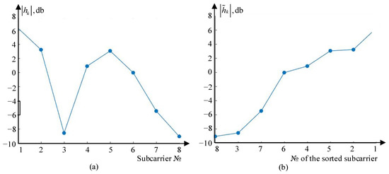 Let us consider an example of the proposed method for N = 8, K = 4, and BPSK modulation. Let an OMA channel of eight subcarriers be given; modules of elements are shown in Figure 5a, and sorted elements are shown in Figure 5b.