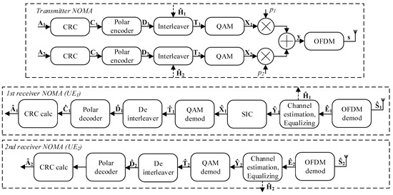 In this paper, we consider two types of communication channels: with OMA (Figure 1) including one transmitter and one receiver, and with NOMA (Figure 2) including one transmitter and two receivers—user equipment (UE) 1 and 2.