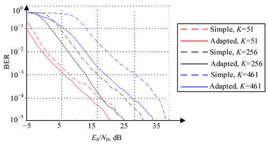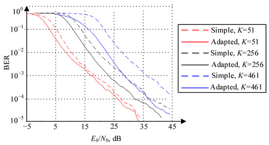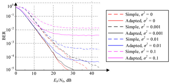 As can be seen from Figure 10, the adaptation reduces the impact of the estimation error and significantly reduces BER. Thus, with σ2 = 10−1, the proposed method reduces BER by more than five times at high values of Eb/N0 (more than 25 dB); with σ2 = 10−2 and σ2 = 10−3, BER is decreased by ≈eight times. In general, it can be noted that, despite the estimation error and, as a consequence, the incorrect sorting of physical subchannels in accordance with (14)–(18), the method does not lose efficiency and reduces BER.