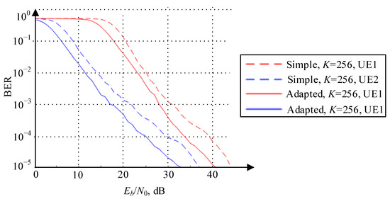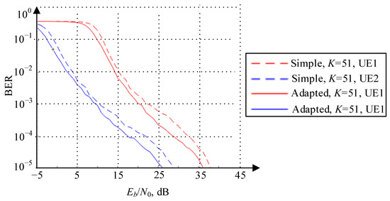 A similar simulation was performed for NOMA (Figure 2 and Figure 7) systems in accordance with the scheme shown in Figure 7. We considered the scenario of resource allocation between two UEs (UE1 and UE2). Upon that, UE1 and UE2 were located at the distances of 100 m and 200 m, respectively. The power between UE1 and UE2 was divided according to (8) in the ratio of p1 = 0.2 and p2 = 0.8. The other parameters corresponded to the OMA system. Figure 11, Figure 12 and Figure 13 show the BER performance dependencies. For Figure 11: K = 51, N = 512 (R ≈ 1/10); Figure 12: K = 256, N = 512 (R ≈ 1/2); Figure 13: K = 461, N = 512 (R ≈ 9/10).