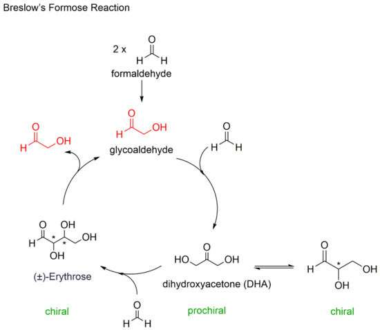 - Breslow, R. On the mechanisms of formose reaction. Tetrahedron Lett. 1959, 1, 22–26. [Google Scholar] [CrossRef]