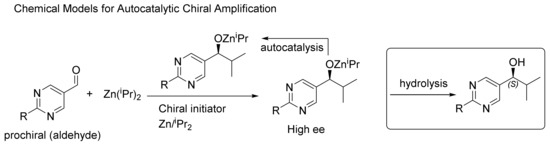 An example of asymmetry-amplifying, autocatalytic alkylation of pyrimidine-5-carbaldehydes with diisopropylzinc, named the ‘Soai reaction’. Elucidation of its mechanism and the role of each chiral initiator used is recently summarized in ref [41].