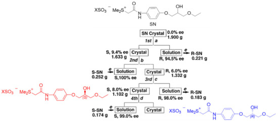 - Tamura, R.; Takahashi, H.; Hirotsu, K.; Nakajima, Y.; Ushio, T.; Toda, F. Unusual disordered crystal structure of a racemate exhibiting a novel enantiomeric resolution: Preferential enrichment. Angew. Chemie-Int. Ed. 1998, 37, 2876–2878. [Google Scholar] [CrossRef]