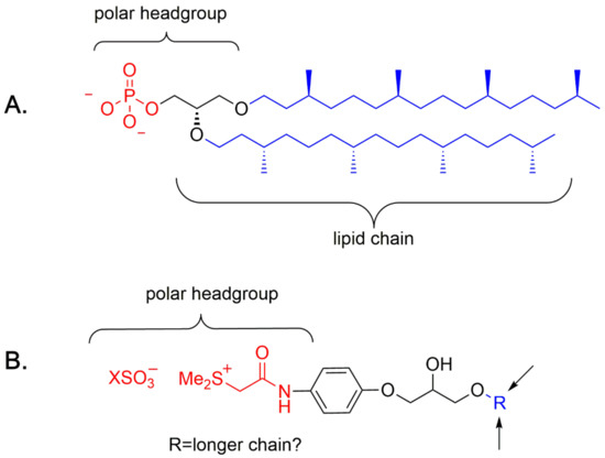 Structural analogies between a phospholipid ether ((A), from archaea) and a general structure from research carried out by Tamura and co-workers and (B) possible modification.