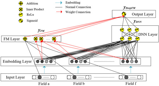 As introduced above, DeepFM is derived from FM. It combines DNN with FM, in which FM focuses on learning the low-order features, whereas DNN attempts to learn the high-order feature combinations. The structure of DeepFM is shown in Figure 1.