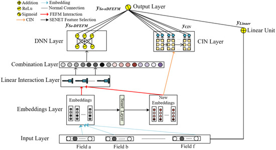 where is the final CTR prediction result, is the sigmoid activation function, is the output of the FM model, is the output of the DNN model, and “” represents the sum of tensors of the same dimension. The effect of this “” operation makes full use of the complementarity among the FM and DNN models. The corresponding feature interactions of DeepFM lack a certain interpretability because the DNN model only implicitly completes high-order feature interactions. It usually recommends less relevant items when the user–item interactions are very sparse or high-rank. Hence, the DeepFM model needs the FM model introduced above to improve the memory ability and interpretability of CTR prediction. Another disadvantage of DeepFM is that it does not implement feature refinement in the low-order features before feature interactions, and the corresponding interaction procedure is too simple. Although the DeepFM model has several apparent disadvantages, it is a firm foundation for creating the proposed Se-xDFEFM model.