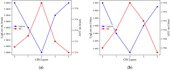 Owing to the deep-level structure, the number of CIN layers could affect the order of explicit feature interactions and impact the final CTR prediction performance of the proposed Se-xDFEFM model. Hence, in this section, we want to decide the best number of CIN layers through validation experiments. The experimental results are shown in Figure 3. We used LogLoss and AUC to draw the corresponding experimental graphs, in which LogLoss follows the left vertical axis, whereas AUC follows the right vertical axis; this represents a concise mode to efficiently present our results.
