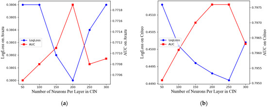 Like the number of CIN layers, the number of CIN neurons also affects the explicit feature interactions procedure and final CTR performance of the proposed Se-xDFEFM model. Hence, in this section, we want to decide the best number of CIN neurons through validation experiments. The experimental results are shown in Figure 4. We used LogLoss and AUC to draw the corresponding experimental graphs, in which LogLoss follows the left vertical axis, whereas AUC follows the right vertical axis.
