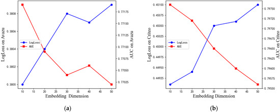 As illustrated in Figure 2, the embedding layer contains the most important low-order feature information for the subsequent high-order feature interaction. Hence, we need to set the dimension of the embedding layer elaborately to obtain the best CTR prediction performance. The validation experimental results are shown in Figure 5. We also used LogLoss and AUC to draw the corresponding experimental graphs, in which LogLoss follows the left vertical axis, whereas AUC follows the right vertical axis.