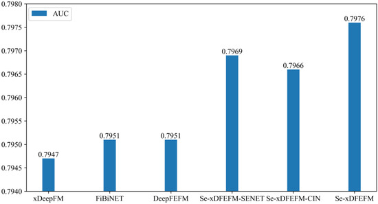 First, the proposed Se-xDFEFM model is compared with the above-mentioned state-of-the-art baseline models (we reproduced all these baselines on our server and completed the relevant experiments using the same experimental settings for fair comparisons). The two metrics, including AUC and LogLoss, are selected to evaluate each CTR model. The experimental results are shown in Table 1. The indicator “Improve1” represents the corresponding performance improvement of the Se-xDFEFM model relative to the most competitive baseline. Similarly, the indicator “Improve2” represents the corresponding performance improvement of the Se-xDFEFM model relative to the second competitive baseline model. For the CTR prediction task, owing to the large amount of data, the measuring standard of these two indicators is ‰, which means that a performance improvement of more than 1‰ is effective and evident [38,39]. The corresponding improvement is essential and helps achieve satisfactory benefits.