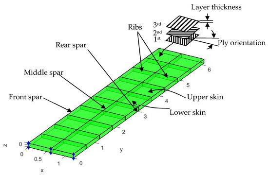 As mentioned in the previous section, the aircraft wing is made of aluminum spars and ribs, while the skin is made of three layers of laminated carbon fiber, as shown in Figure 3. The thicknesses of the aircraft wing structures and the ply orientations of the skin layers are set as design variables. The total number of design variables is 14, considered from 2 groups of the aircraft wing structure, i.e., the thickness of the rib, spar and skin, and composite ply orientations, which can be described as follows.