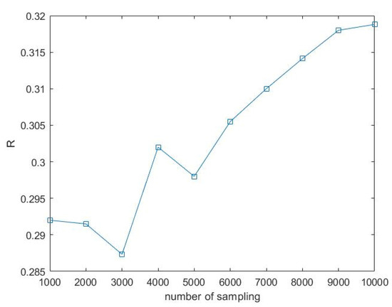 The validation of the proposed technique with the traditional MCS probabilistic approach is needed to confirm that the proposed technique can generate an equivalent reliability solution. The validation experiment starts by selecting design solutions from the Pareto front in Figure 4b, which are the solution numbers 7, 1, 14, and 6. The selected solutions are the non-dominated solution for the bi-objective problem. To make it possible to compare with the probability technique, MCS is used to generate the set of 10,000 sampling points of the random variables at those selected non-dominated solutions. Then function evaluations by means of finite element analysis and computational aeroelastic analysis of those 10,000 points of random variables are performed and used for computing the reliability value (R) for all selected solutions. Moreover, the convergence analysis examined in solution 1 is presented in Figure 6, which demonstrates that the reliability index R converges at 10,000 random numbers. The reliability values of the selected solutions are presented in Table 3. The results show that the increasing reliability values correspond to the decreasing PSI values in the sense that the higher R or the lower πfmax means the safer structure. The new approach can be used to generate more reliable solutions when compared with the MCS, which is supported by the previous research in [12,33,34]. Furthermore, the results demonstrate that the proposed technique, which was developed to describe epistemic uncertainties, is acceptably good. It, nevertheless, needs the experience of a good designer to define the criteria of uncertainty [11].