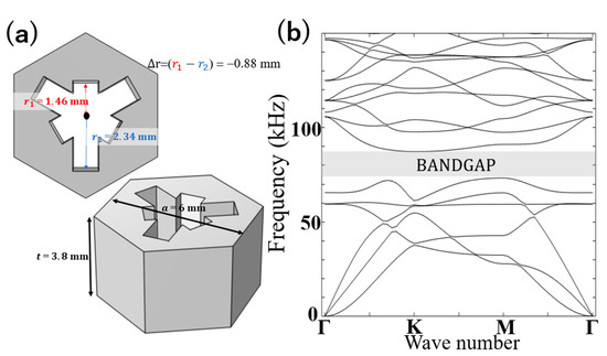 As shown in Figure 1a, the hexagonal lattice has dimensions with a lattice constant of a = 6 mm and a thickness of t = 3.8 mm. The snowflake-like scatterer has six legs with a width w = 1.1 mm, and the legs with lengths r1 (center-to-red outline) and r2 (center-to-blue outline) are alternatively arranged. The mirror symmetry of the unit cell can be broken by changing the difference between r1 and r2 (Δr = r2 − r1) while maintaining the total length constant. (We chose r1 + r2 = 3.8 mm so that each leg is precisely fabricated without touching/coalescing with each other.) In our design, the plate was made of polypropylene (PP), and the mass density, Young’s modulus, and Poisson’s ratio of PP were 900 kg/m3, 1.47 GPa, and 0.4, respectively. Numerical calculations on eigenmode analyses and elastic wave propagations were performed by solving the linear elastic wave equation for isotropic materials using the COMSOL Multiphysics software package [39] based on the finite element method (FEM).