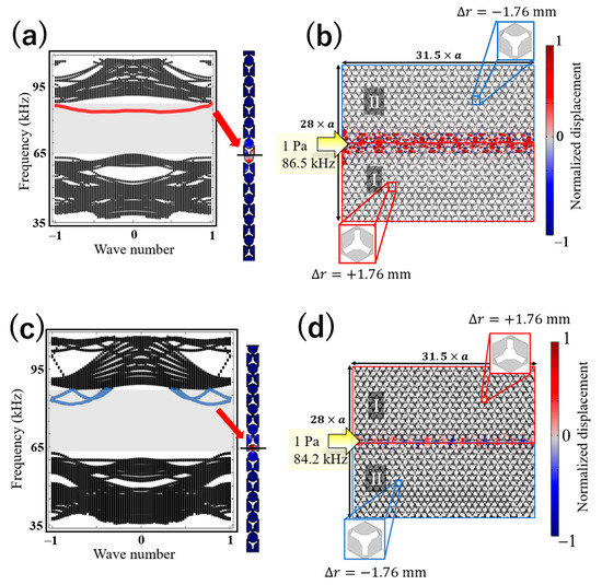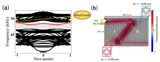 To demonstrate that the current numerical design also optimizes robustness, we performed a transmission analysis of the intermediate parameters Δr. Figure 5a shows the supercell band diagram with Δr = +0.88 mm at the top and Δr = −0.88 mm (I–II) at the bottom. Figure 5b shows the transmission analysis results of the Z-shaped waveguide excited with the 88.33 kHz edge mode shown in red, which appeared in the supercell analysis. It can be observed that the displacement near the end of the waveguide is smaller and blurred owing to the leakage of the wave into the bulk despite the edge mode. This can be attributed to the coupling of the edge mode with the bulk mode in the band (Figure 5a), as described in Section 2.1.