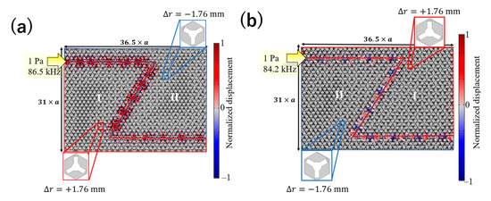 Structures and displacement fields for incident wave at 84.2 kHz in Z-shaped topological waveguides designed with (a) I–II and (b) II–I interfaces, respectively, between the unit cells of Δr = 1.76 mm.