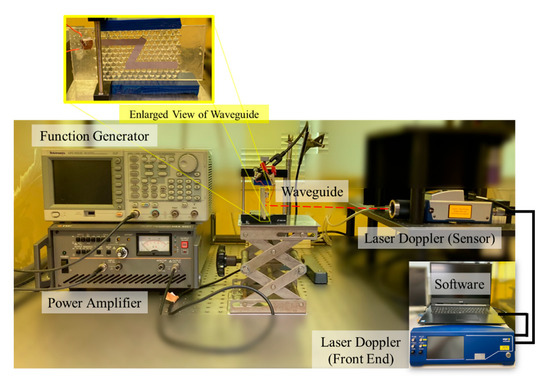 Experimental system: The electrical signal output from the function generator is amplified by a power amplifier. The electrical signal is converted to elastic wave via a piezoelectric transducer attached to the fabricated waveguide. The out-of-plane displacement of the surface acoustic wave propagating through the waveguide is measured using a laser Doppler vibrometer (VIO-130 manufactured by Polytec GmbH).
