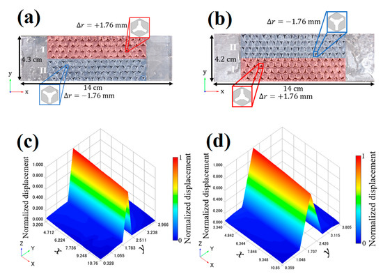 Figure 6 shows the experimental setup for the measurement of elastic wave propagation. In the experiment, a continuous wave of 4.7 Vpp (peak-to-peak voltage) obtained from a function generator on the transmitting side was amplified to 188 Vpp using a power amplifier and converted into an elastic wave through a transducer. The induced elastic waves were measured and mapped using a laser-Doppler vibrometer. Unnecessary waves due to reflection from the edge of the plate were removed by attaching a sound-absorbing material to the sides. Figure 7 and Figure 8 include photographs of waveguide fabricated using a 3D printer (Form 3+ manufactured by Formlabs Co.) [42]. For a topological linear waveguide with a boundary between two phases (I–II), the displacement was measured at 140 points (Figure 7a), and for another type of interface (II-I), it was measured at 113 points (Figure 7b). The results are presented in Figure 7c,d. The values on the vertical axis in Figure 7c,d are the amplitudes of the out-of-plane displacement normalized by the amplitude at the points near the incident wave. Similar to the numerical simulations in Figure 3b,d, a large displacement can be observed only along the interfaces.