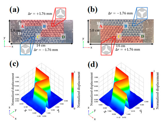 Z-shaped valley topological waveguides with (a) the II–I interface and (b) I–II interface. (c,d) depict distributions of normalized displacement. (See text for what A–D in (a,b) denote).