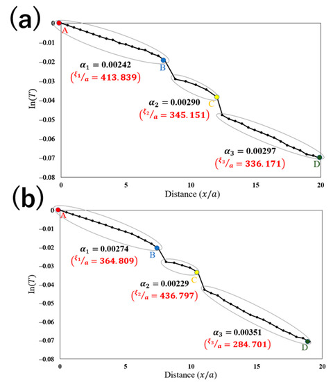 Logarithmic plots of the transmittance (T) along the paths of the Z-shaped waveguides (a) with the II–I interface and (b) with the I–II interface.