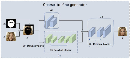 The scheme of our coarse-to-fine generator. The coarse-to-fine generator is based on two ResNet-like completion networks. The generator is symmetric in structure. The generator uses a multi-component loss that combines adversarial loss and a high receptive field perceptual loss based on VGG-16.