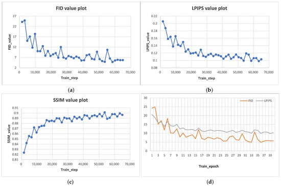 We trained our model using 40 epochs. During training, we recorded training loss every 250 steps. After each epoch, validation was performed on the validation set and the FID, LPIPS, and SSIM were calculated. We visualize the data in Figure 4 and Figure 5. In the early stage of training, the loss curve decreases rapidly. The FID, LPIPS, and SSIM indicators also showed rapid improvement. As the training enters the middle and late stages, the loss function begins to converge, and the loss curve tends to flatten. At this time, the FID and LPIPS values also oscillate at low points; SSIM oscillates at high points. We scaled LPIPS up by a factor of 10 to trade off the FID and LPIPS since the LPIPS indicator is in the 0.09–0.30 range, as shown in Figure 5d.