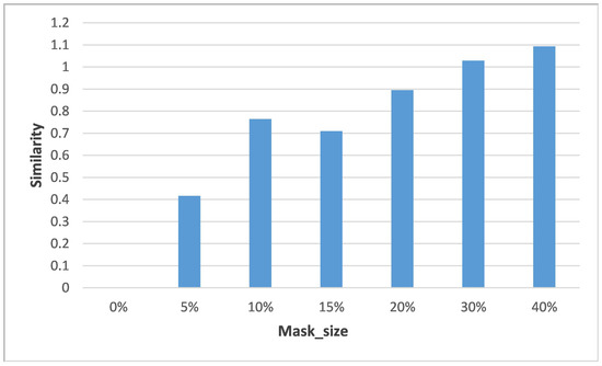 The results of our method produced are presented in Figure 6. We standardized the way the image was masked by using square or rectangle masks. Then, we used FaceNet [31] to calculate the cosine distance between them and the reconstructions. FaceNet is a method that directly embeds face images into Euclidean space. In Euclidean space, distance corresponds directly to a measure of face similarity. A distance of 0.0 means the faces are the same; 4.0 corresponds to two opposite, different identities. A threshold of 1.1 correctly classifies each pair. Table 2 and Figure 7 show the distance of the faces between the original and reconstructed. Their distances are all less than the threshold of 1.1 under different mask sizes. This shows that our model completion works well.