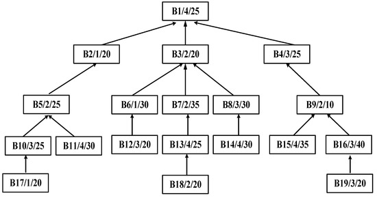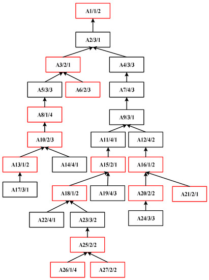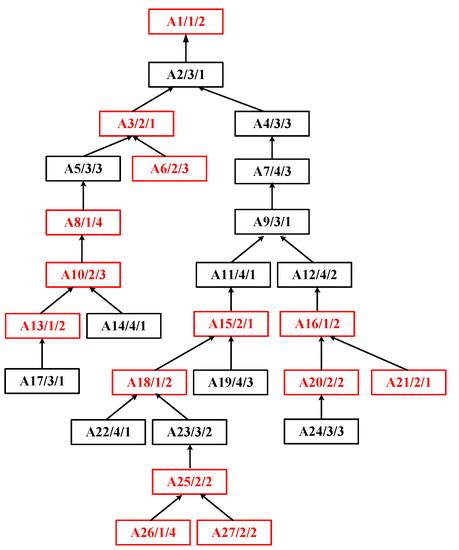 The process tree of complex product A is shown in Figure 2, which is asymmetric and has 27 operations to be processed on four machines. In the process tree, each node represents an operation. Additionally, it contains three kinds of information: the operation number, the machine number, and the processing time. The arrow connects each operation and its immediate successor operation. This represents the precedence constraint between the operations, and each arrow points to the operation with a lower precedence. For example, the node with A3/2/1 means that operation A3 must be processed on machine 2 for one working hour. Its immediate predecessors are A5 and A6. Its immediate successor is A2. Therefore, A3 can only be processed after the completion of A5 and A6.