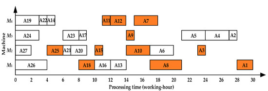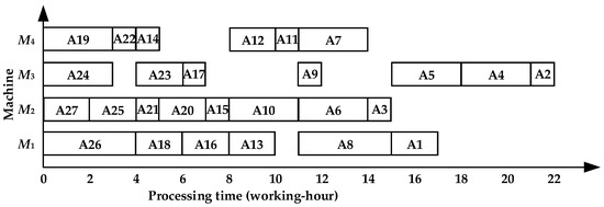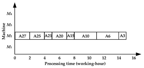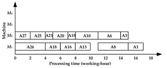 - TSACCSP does not consider the processing and utilization of multi-operation machines during the determination of the starting time of operations, which affects the overall scheduling effect. A comparative analysis of Figure 8 and Figure 10 shows that the more-time machine M2 is idle from t = 0 to t = 2, t = 5 to t = 7, t = 14 to t = 18, and t = 19 to t = 24 in Figure 10. In Figure 8, the starting times of A27, A25, A15, A6, and A3 are 7, 8, 17, and 5 working hours, earlier than those in Figure 10, respectively. This only increases the tightness of continuous processing on M2, but it also increases the more-time machine utilization rate by 9.9%.