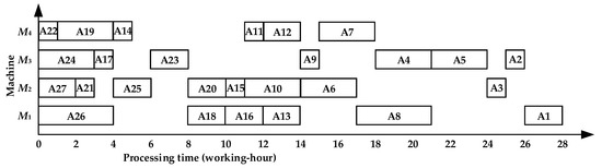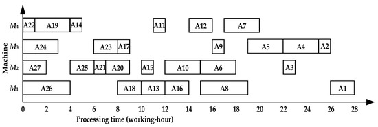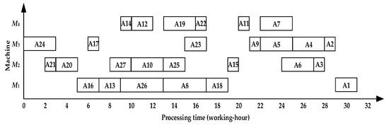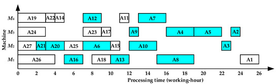 The initial scheduling scheme obtained by TSACCSP is {A1, A2, A4, A7, A9, A11, A15, A18, A23, A25, A26}, and the operations are scheduled by sequence {A3, A5, A8, A10, A13, A17, A12, A16, A20, A24, A6, A19, A27, A21, A14, A22, A26} on the basis of it. The reverse sequence is shown in Figure 10 with 31 working hours.
