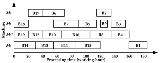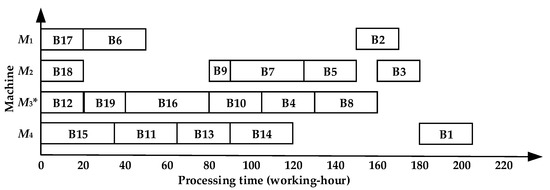 The scheduling sequence by HIS-PCVM on M3 is {B19, B13, B11, B6, B9, B4}, and on the general machine, it is {B18, B15, B14, B12, B17, B8, B7, B16, B5, B3, B2, B10, B1}, as shown in Figure 13. The makespan is 185 working hours.