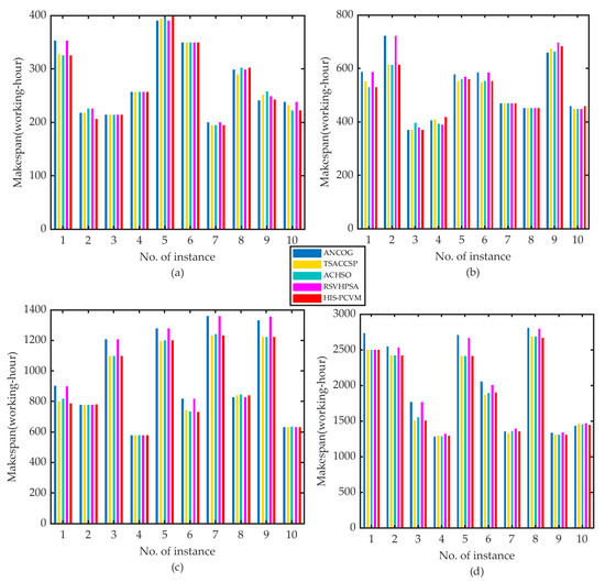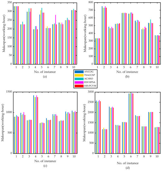 Results of ANCOG, TSACCSP, ACHSO, RSVHPSA, and HIS-PCVM for integrated scheduling with symmetric structures: (a) 20 operations, (b) 50 operations, (c) 100 operations, and (d) 200 operations.