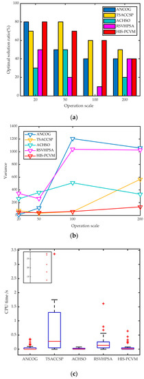 Figure 18 shows the results of products with symmetric structures. In Figure 18a, the optimal solution ratios of TSACCSP always keep a relatively high rate in large operation scales. Although the optimal solution ratio of HIS-PCVM is slightly less than TSACCSP, it also has a good performance. However, when we see it in conjunction with Figure 18b,c, it is better to choose HIS-PCVM rather than TSACCSP. This is because the variance curve of HIS-PCVM is at a lower level than TSACCSP, and the CPU time of HIS-PCVM is better than TSACCSP. Just like the results of asymmetric structures, TSACCSP needs to spend more time when the operation scale is large. Additionally, the performances of the other three algorithms are poor, although the CPU time of ACHSO is the best.