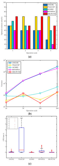 Comparison results of ANCOG, TSACCSP, ACHSO, RSVHPSA, and HIS-PCVM for integrated scheduling with asymmetric structures: (a) optimal solution ratio, (b) variance curves, and (c) CPU time (the points in the small square are the outliers for TSACCSP).