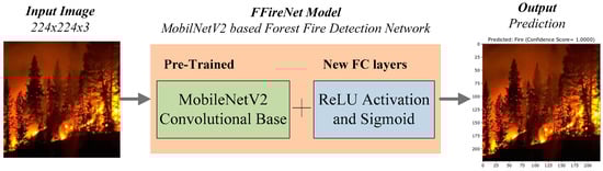 We propose the CNN-based FFireNet method for the classification of forest fires. Subsequently, CNN-based applications require substantial computing power and data for optimal training and achieving high accuracy in detection. To overcome the dataset and computing power limitations, a deep learning technique known as transfer learning has shown promising results [36]. In transfer learning, the weights of a pre-trained CNN model trained on a different dataset for classifying numerous objects are frozen, and new fully connected layers are added to learn entirely new tasks with a dataset associated with this new task. In this research, the task of classification of forest fires is performed using MobileNetV2 [37] as a backbone network, which is originally trained on the ImageNet dataset [38]. We froze the weights of the convolutional base and added fully connected layers using activation functions.