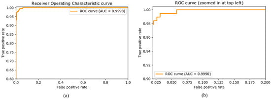 The proposed method has and of 97.37% and 99.47%, respectively, and 0.53% and 2.63% , as shown in Table 7. The Receiver Operative Characteristic (ROC) curve is a graphical representation that shows the prediction ability of a binary classifier as the prediction threshold is varied. The ROC curve is achieved by plotting (also known as sensitivity or recall) against . The Area Under the Curve (AUC) is a metric for class separability that indicates how effectively a model can discriminate between them. The higher the AUC score, the better the model’s performance at properly predicting classes. Figure 7 illustrates the ROC curve of the proposed method. The AUC value of 0.9990 indicates that the model has a 99.90% chance of correctly discriminating between positive and negative classes.
