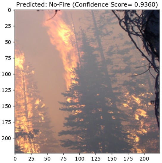 It is essential to minimize the false classifications in the forest fire detection problem. The false alarm percentage is crucial for forest fire detection as it weighs on the method’s applicability and reliability in real world. The classification threshold of the proposed approach is 0.5, which means that the image is assigned a label ‘Fire’ having a predicted probability value greater than 0.5, and is otherwise assigned ‘No-Fire’. Figure 10 shows randomly selected cases of . The reason for the misclassification of No-Fire images () may be that the color of sunlight is similar to that of fire and the proposed approach mistakenly interpreted it as a Fire image. In addition, the similar manifestations of sunset on the mountain top and mountain fire also confused the proposed approach. Moreover, the autumn leaves of the tress also looked similar to the fire. The image of dense fog around the mountains is considered to be fire smoke, resulting in false positives. It is pertinent to note that we observed only five false positive cases. These are perhaps due to the lack or insufficient representation of such regions from various angles in the training data, resulting in images without the fire being incorrectly labeled as fire images. However, it is interesting to note that the confidence score of the model for false classification is less than 90% for most of the cases. In order words, these can be considered as nearly missed cases where the model was not fully sure of the predictions.
