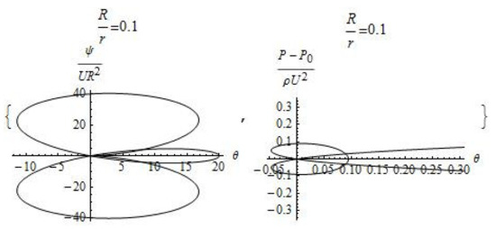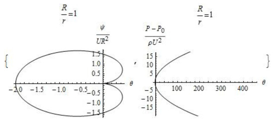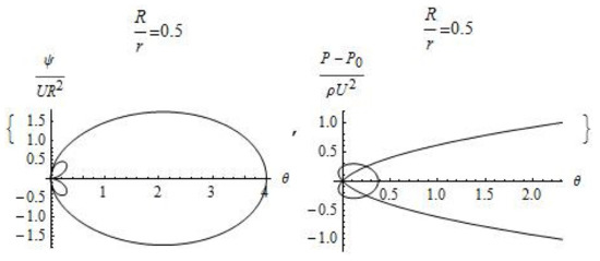 The velocity of motion is equal to zero at the point of intersection of the lines on which the stream function is equal to zero. The pressure, in accordance with the Bernoulli Equation (5), at a given point takes on a maximum value equal to the sum of the external pressure and the kinetic energy of the external flow. The area of reduced pressure is separated from the external flow by a paraboloid of revolution, the center of which is located at distance in front of the body. The zone of zero pressure covers all surface of the moving body and turns to be a cylindrical surface at a distance of sufficiently large meanings of , the radius of which does not depend on the velocity of motion and is determined by the pressure at infinity and by the density of the fluid: