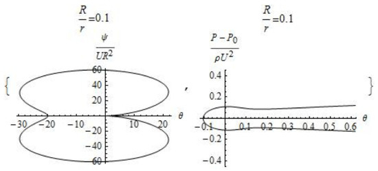 where . In the case of a source as the origin of the flow field, the parameter is positive, and in the case of a sink, in Formula (8) it is necessary to change the sign in the terms containing the first powers of . Then we should obtain expressions for the hydrodynamic fields.