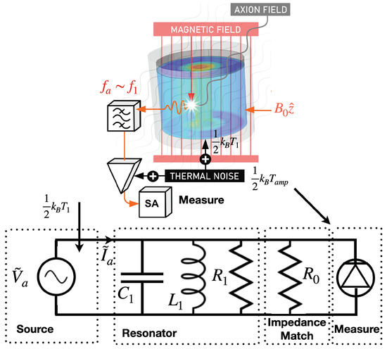Schematic of a resonant cavity haloscope (above) and equivalent circuit (below). Resonant conversion of the axion mixing with the DC magnetic field, , creates a photon of frequency near the cavity resonance frequency, . The observable signal, Equation (10) competes with the thermal noise sources given in Equation (12).