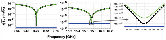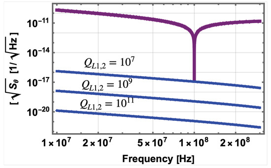 which is plotted in Figure 6 for achievable experimental values, , , GHz, and amplitude noise dBc/Hz [114]. Cavity Q-factors are calculated from mode geometry factors, , where is the surface resistance [107,112,113].