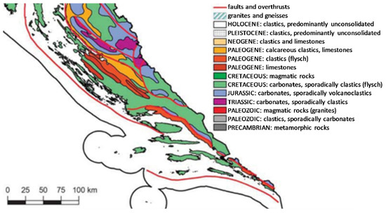 Geological map with the occurrence of Dalmatian marl with orange color (modified after Mostečak et al. [16]).