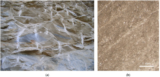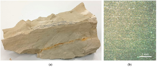 Characteristic features of marls from the Dalmatian area. (a) The bright yellow Dalmatian marl; (b) microscopic image of Dalmatian marl (crossed polars), from Aljinović [17].