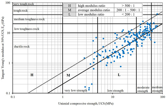 Such an approach, using the correlations of rock properties, was applied and described by Šestanović [1,2], Kanji [3], Kanji and Galvan [4], Faim, Andrade and Figueiredo [5], Sharma and Singh [6], Vasanelli et al. [7], and Ameratunga, Sivakugan and Das [8], which are discussed more in Section 4. Alongside authors dealing with engineering rock mechanics, Hudson and Harrison [9] also describe the determination of rock mass properties (e.g., overall modulus of deformation; modulus of deformation of a rock mass) and rock failure criteria (and hence, also the tensile strength, cohesion, and friction angle) using intact specimen properties (UCS, Es) together with discontinuity parameters. These approaches emphasize the importance of the input intact rock parameters, especially the UCS, as probably the most widely used design parameter.