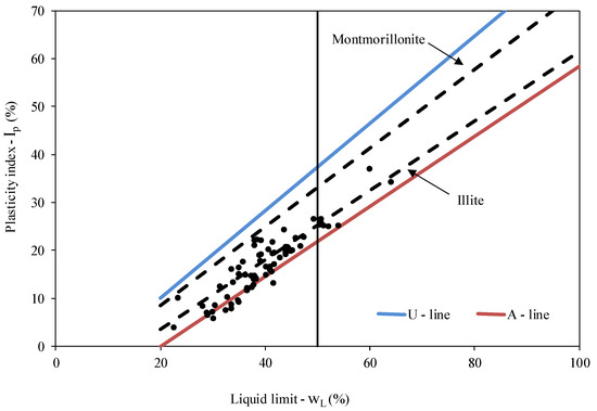 Weathered marls, clayey marls, and marly clays, for which Atterberg limits were tested, can be observed through a Casagrande-Mitchell plasticity diagram [20]. Using this diagram, clay components in marl can be determined based on plasticity index (Ip) and liquid limit (wL) values. Clay component minerals react with water, which leads to swelling and breaking of the cohesive bonds between the solid particles by weathering. As is shown in Figure 5, Dalmatian area marls dominantly contain illite minerals, which are not overly prone to swelling.