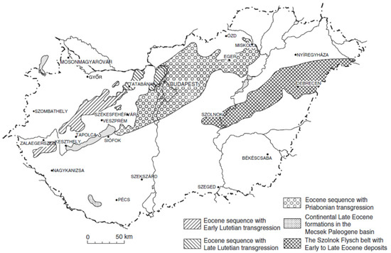 Distribution of the Eocene depositional systems in Hungary. Buda marl is found within the Priabonian transgression system, marked by circled pattern as ‘Eocene sequence with Priabonian transgression’ (modified after Haas [26]).