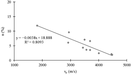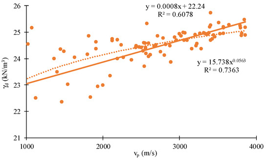 The porosity (n) and ultrasonic pulse wave velocity (vp) of the Dalmatian area marls show very high correlation with the coefficient of determination, R2 = 0.81 (Figure 8). Better correlation could be obtained by increasing the number of data; i.e., increasing the application of ultrasonic pulse wave velocity tests in practice. For the Buda marl, the correlation between dry density and ultrasonic pulse wave velocity results in almost the same R2 value as the previously described porosity—US wave relation for the power function. The value of the coefficient of determination is R2 = 0.74, but for linear regression the R2 value is smaller: R2 = 0.61 (Figure 9).